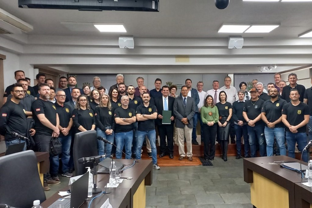 A Câmara Municipal de Chapecó fez a entrega, na tarde desta quarta-feira (28), de moção para parabenização, ao Centro de Apoio Operacional de Combate aos Crimes Contra o Agronegócio, da Polícia Civil de Santa Catarina (Caoagro/PCSC), pelo primeiro ano de atuação. O autor desta proposta, vereador Cleber Fossá (MDB), e presidente do Poder Legislativo, vereador Fernando Cordeiro (PSC), fizeram a entrega deste documento no início da sessão ordinária do Legislativo.